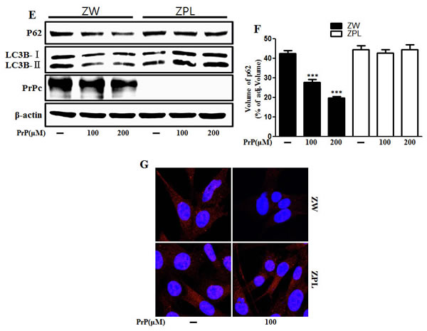 Figure 6: Autophagy and neurotoxicity by PrP (106-126) treatment was inhibited in PrnP deficient cells. A. ZW 13-2 and Zpl 3-4 cells were incubated with PrP (106-126) in a dose-dependent manner for 24h. Cell viability was measured by annexin V assay. Cells were treated with FITC-annexin V and PI, which binds to phosphatidylserine to the plasma membrane and nuclei during apoptosis. B. Bar graph indicating the average number of annexin V negative cells. C. Representative immunofluorescence images of TUNEL-positive (green) ZW or Zpl cells at 24 h after exposure to 100 μM of PrP (106-126). The cells were counterstained with PI (red) to show all cell nuclei. D. Lactate dehydrogenase (LDH) assay was used to quantify LDH released into the medium. E. ZW 13-2 and Zpl 3-4 cells were incubated with PrP (106-126) in a dose-dependent manner for 6h. The incubated cells were assessed for LC3B production, prion protein and P62 expression by western blot analysis. β-actin was used as loading control. Bar graph indicating the average values of p62 expression levels F.. G. ZW 13-2 and Zpl 3-4 cells were stained with rabbit anti-p62 (red) and DAPI (nuclei, blue) for immunocytochemistry using confocal microscopy. *** p < 0.001; significant differences between each treatment group. PrP, Prion peptide (106-126); PrPc, normal prion protein; adj.volume, adjustment of volume (band volume minus background volume).