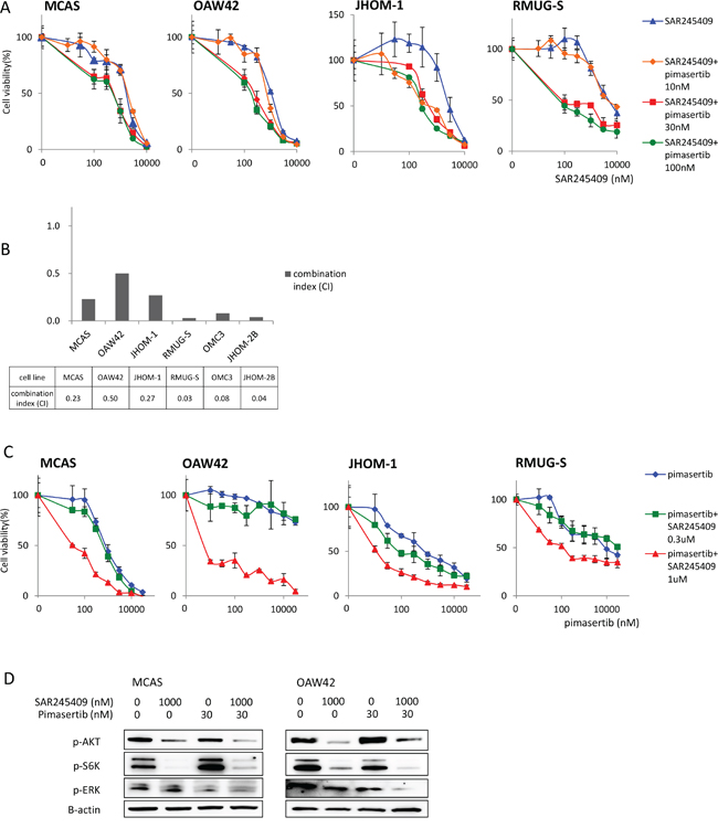 Figure 2: Enhanced antitumor effects of combination treatment with SAR245409 and pimasertib. A. MTT assays following combination SAR245409 and pimasertib treatment. The pimasertib concentration was fixed at 100, 30, or 10 nM, and the data were compared with those following treatment with SAR245409 alone. The results are shown as the mean ± SE of 3 independent experiments. B. CIs were calculated using the Chou–Talalay method. Each cell line was treated with 30-nM pimasertib and SAR245409 (30–10,000 nM). A CI <1.0 indicated a synergistic effect. C. MTT assays following combination therapy. The SAR245409 concentration was fixed at 300 or 1 μM, and the data were compared with those obtained after treatment with pimasertib alone. The results are shown as the mean ± SE of 3 independent experiments. D. Phosphorylation of AKT, S6K, and ERK were evaluated by western blotting after treatment with 1-μM SAR245409, 30-nM pimasertib, or a combination thereof.