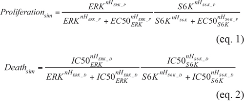 where Proliferationex represents the normalized total cell number, which is the sum of the data of the MTT (live cells) and LDH (dead cells) assays (0 < Proliferationex < 1), and Deathex represents the number of dead cells, measured by the LDH assay. i indicates the i-th experimental conditions. By optimizing these parameters, the contributions of ERK and S6K to proliferation and cell death were obtained as a Hill function.