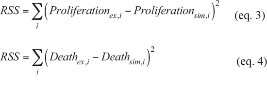 where Proliferationsim and Deathsim indicate the simulated number of total cells and dead cells, respectively (0 < Proliferationsim < 1, 0 < Deathsim < 1). We also prepared two additional wells having the same cell numbers, without inhibitors, and measured live cells in 1 well in an MTT assay, while we induced cell death with an SDS-containing solution and measured dead cells in LDH assay in the other well. These data demonstrated how many cells were produced in individual wells, indicating effects on cell proliferation, which is inversely related to cytostatic effects. ERK and S6K represent normalized ERK and S6K activities as measured by FRET imaging 3 h post-inhibitor treatment, respectively (0 < ERK < 1, 0 < S6K < 1). The fitted parameters are as follows: nHERK_P and nHS6K_P are Hill coefficients for ERK and S6K in Proliferationsim, respectively. nHERK_D and nHS6K_D are Hill coefficients for ERK and S6K in Deadhsim, respectively. EC50ERK and EC50S6K are the 50% effective concentrations of ERK and S6K for proliferation, respectively. IC50ERK and IC50S6K are the 50% inhibitory concentrations of ERK and S6K for cell death, respectively. The parameters were obtained by minimizing the residual sum square (RSS):