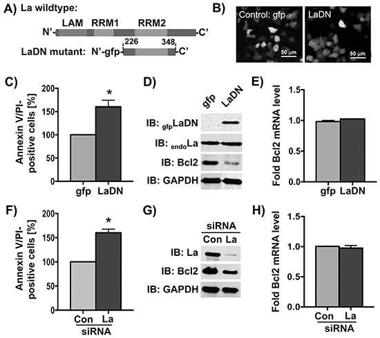 Figure 2: Bcl2 protein expression is reduced by siRNA-mediated La depletion or transient expression of La dominant negative (LaDN) mutant in cells. A. Scheme of LaDN mutant compared to La wildtype containing three RNA-binding motifs: LAM, RRM1, and RRM2. B. Fluorescence microscopic image of gfp or LaDN mutant expression in living SCC 22B cells. La depletion in SCC 22B cells by C-E. transient expression of La dominant negative (LaDN) mutant or F-H. La-specific siRNA (La siRNA), results in increased cisplatin-induced apoptosis (Annexin/PI-positive cells) after cisplatin treatment with 24 μM for 24 hours, reduced Bcl2 protein expression (GAPDH = loading control), and unchanged Bcl2 mRNA level as determined by RT-qPCR analysis and normalized to GAPDH mRNA. Con = control siRNA. P value < 0.05 (one asterisks). Data shown are representative of three independent experiments (n = 3).