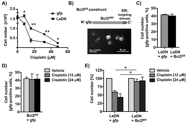 Figure 3: Transient expression of Bcl2ER rescues cisplatin resistance of LaDN-expressing cells. A. Cisplatin sensitivity is increased in LaDN- compared to gfp-expressing SCC 22B cells. Two independent experiments in triplicates were performed (P value < 0.05 (one asterisks), < 0.005 (two asterisks), n = 2). B. Upper panel: Scheme of Bcl2ER construct. Bcl2’s carboxy-terminal targeting sequence is replaced with Cytochrome b5, which targets Bcl2 to the endoplasmic reticulum (ER). Lower panel: Fluorescence microscopic image of living SCC 22B cells transiently expressing Bcl2ER. C. Control: Cell numbers are unchanged in cells expressing LaDN mutant alone or with Bcl2ER. D. Control: Cell numbers are unchanged in cells expressing Bcl2ER alone, and treated with or without cisplatin. E. Increased cisplatin sensitivity of SCC 22B cells transiently expressing LaDN mutant can be rescued by co-expression of Bcl2ER. P value < 0.05 (one asterisks, n = 3).