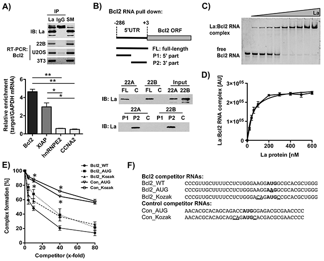 Figure 4: The La protein binds to a region of Bcl2 mRNA embedding the authentic translation start site. A. Upper panel: RNA immuoprecipitation (RIP) applying a La-specific antibody followed by Bcl2-specific RT-PCR in three different cell lines (immunoblot (IB)). Lower panel: RIP followed by RT-qPCR analysis was performed in triplicates on RNA extracted from RIP pellets. Cell extracts for RIP experiments were prepared from HEK 293 cells stably transfected with gfp alone (control) or gfp-tagged La. None of the target mRNAs analyzed were detected in cells expressing gfp alone. Relative enrichment of target mRNA compared to GAPDH mRNA was calculated (n = 3). B. Scheme of Bcl2 RNA probes (FL, P1, P2) applied for RNA pull-down assays, and La-specific immunoblot (IB) following Bcl2 RNA pull down from SCC 22A and SCC 22B cell lysates. Data shown are representative of three independent experiments (n = 3). No RNA probe was added in the control (C). C. Binding affinity of La:Bcl2 RNA oligonucleotide interaction as determined by electrophoretic mobility shift assay (EMSA). The 5’FAM-labeled Bcl2 RNA oligonucleotide (25 nM) was incubated with increasing amounts of recombinant La protein in a range from 0 to 600 nM and separated by a native EMSA. D. The La:RNA complex formation is plotted against the La protein concentration. The dissociation constant (KD) was determined as 50.5+/-5.9 nM (n = 3) in Prism 5 (GraphPad Software). E. Competitive fluorescence polarization assay using 5’FAM-labeled Bcl2 RNA oligonucleotides and different unlabeled competitor RNA oligonucleotides at 4-, 10-, 40-, or 80-fold excess. P value < 0.05 (one asterisks), n = 3. F. Sequence of competitor Bcl2 RNA oligonucleotides (Bcl2_WT, Bcl2_AUG, Bcl2_Kozak) and two unrelated control RNA oligonucleotides (Con_AUG, Con_Kozak). Translation start site (AUG) in bold and nucleotides changed compared to wildtype (WT) RNA are underlined.