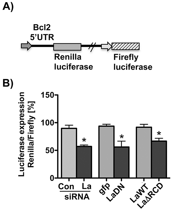 Figure 6: La-dependent Bcl2 5’UTR-driven reporter. A. Scheme of the Bcl2 5’UTR-driven reporter in which the Bcl2 translation start site and surrounding sequences (nucleotides −286 to +29) were cloned upstream and in frame with the Renilla luciferase open reading frame. B. SiRNA-mediated La depletion or transient expression of La mutants (LaDN or LaΔRCD) reduces Renilla luciferase reporter expression in SCC 22B cells. P value < 0.05 (one asterisks), n = 3.