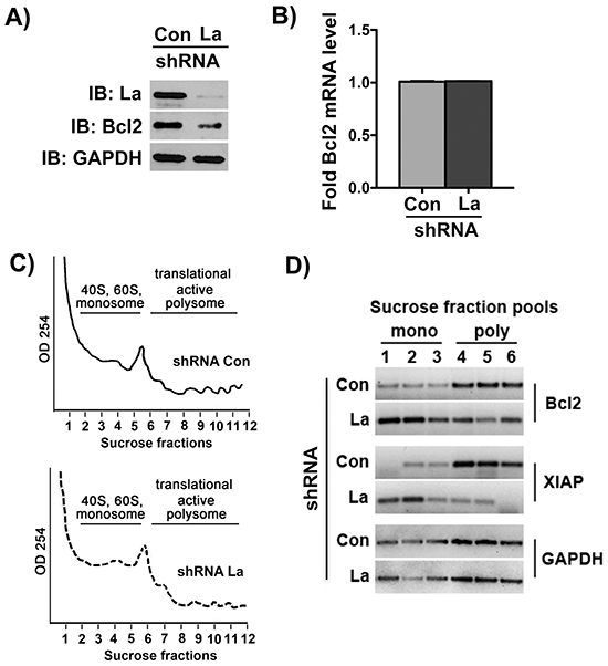 Figure 7: The La protein stimulates Bcl2 mRNA translation. Cell lysates for polyribosome fractionation prepared from La-depleted (shRNA La) and control-treated (shRNA Con) SCC 22B cells treated with 24 μM cisplatin for 24 hours demonstrate that A. Bcl2 protein expression is reduced, but B. Bcl2 mRNA level normalized to GAPDH mRNA are unchanged. IB: immunoblot GAPDH expression was not affected and served as loading control. C. Representative polyribosome fractionation of two independent experiments of control-treated and La-depleted SCC 22B cells. D. For PCR amplification we pooled two fractions of the gradient, ending up with 3 samples representing the translational inactive portion of the gradient (mono) and three fractions of the translational active portion (poly) of the gradient. Agarose gel electrophoresis of RT-PCR products amplified from Bcl2, XIAP and GAPDH mRNA isolated from monosome (mono) and polysome (poly) fractions demonstrates that Bcl2 and XIAP mRNA accumulates in translational inactive fractions in La-depleted SCC 22B cells. The translation of GAPDH mRNA is not affected by La depletion.