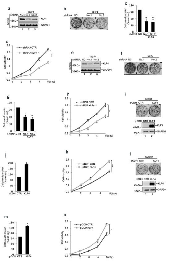 Figure 1. KLF4 enhanced human osteosarcoma cells clonogenicity and growth. shRNA mediated silencing of KLF4 expression in human osteosarcoma cell lines. a. and e. Western blot detected the expression of KLF4 in MG63 and SaOS2 cells. GAPDH was detected as loading control. b–c. and f–g. Colony formation assay was used to measure the clonogenicity of MG63 and SaOS2 cells with or without knockdown KLF4. The numbers of control cells were set as 100%.(n=3, mean ± SD, t-test, n**P<0.01 vs. shRNA CTR). d. and h. Cells with or without knockdown KLF4 were cultured for the days as indicated and cell growth was evaluated by CKK8 assay. Results are representative of three independent experiments. *P<0.05, **p<0.01 and ***p<0.001 vs Ctr. i–j. and l–m. Colony formation assay was used to measure the clonogenicity of MG63 and SaOS2 cells with or without overexpression of KLF4. The numbers of control cells were set as 100% (n=3, mean ± SD, t-test, **P<0.01 vs. CTR). Western blot was used to detect the expression level of KLF4. k. and n. CKK8 assay was used to measure the cell viability of MG63 and SaOS2 with or without overexpression of KLF4.