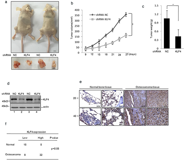 Figure 2. KLF4 promoted human osteosarcoma cells tumorigenicity in a nude mice model. a. shRNA KLF4 or shRNA NC infected MG63 cells were injected subcutaneously into either side of the posterior flank of the same nude mouse (n =6 per group). The tumor size is shown in Figure 2a. The black bar represents 1 cm. b. The tumor growth curve is displayed in Figure 2b. c. The final tumor weight is shown in Figure 2c. d. Western blot decided the efficiency of KLF4 in the tumors shown in Figure 2a. e–f. KLF4 protein level in osteosarcoma and normal bone tissues was detected by immunohistochemical staining.