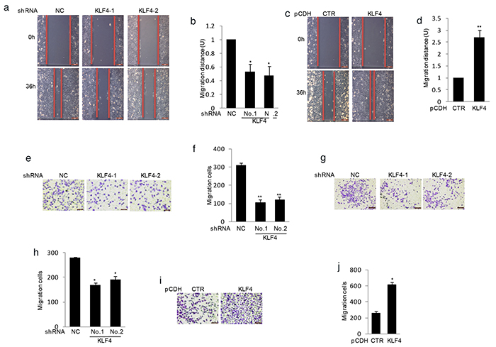 Figure 3. KLF4 elevated human osteosarcoma cells migration. a–d. KLF4 were overexpressed or knockdown in MG63 cells using lentivirus vectors. The effects of KLF4 on cell migration were examined by wound-healing assay. Bar graph quantification of migration distance. U, units. Results are representative of three independent experiments. *P<0.05, **p<0.01 and ***p<0.001 vs Ctr. e–g. Effects of KLF4 on the migration were examined by Matrigel migration assay in MG63 (e) and SaOS2 cells (g). Migrated cells were plotted as the average number of cells per field of view. Results are representative of three independent experiments. *P<0.05, **p<0.01 and ***p<0.001 vs Ctr. i–f. KLF4 were overexpressed in MG63 cells and its effect on cell migration were examined by Matrigel migration assay. Results are representative of three independent experiments. *P<0.05, **p<0.01 and ***p<0.001 vs Ctr.