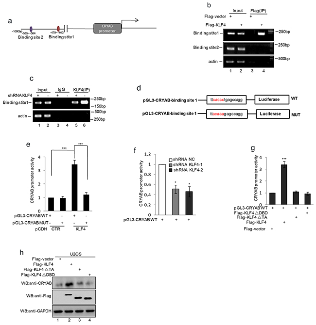 Since CRYAB was found to be regulated by KLF4, we first inspected the genomic sequence upstream of CRYAB coding region by using the JASPAR software. Two putative KLF4 binding sites located 585-564 and 479-463bp upstream of CRYAB translational start site were identified (Figure 5a). To determine whether KLF4 binds the putative sites in vivo, we performed chromatin immunoprecipitation (ChIP) to detect the relevant DNA-protein interaction. As shown in Figure 2b, the CRYAB promoter in the nt - 479 to -463 region was detected in the KLF4 overexpressed MG63 cells. Similarly, the subsequent chromatin immunoprecipitation assay using anti-KLF4 antibody showed that the nt - 479 to -463 region was specifically present in anti-KLF4 immunoprecipitates, which was, however, diminished by KLF4 knockdown (Figure 5c). To further veritify the nt - 479 to -463 region was indeed responsive to KLF4, a series of pGL3-based luciferase reporter plasmids containing the wild type KLF4 binding region, a mutant binding region were generated (Figure 5d). These plasmids were individually transfected into MG63 cells with or without KLF4 overexpression, followed by the measurement by the transcriptional activities using luciferase assay. As shown in Figure 5e, pGL3 luciferase reporter plasmid containing the wild type KLF4 binding region, but not the mutant plasmid, showed a KLF4 responsive transcriptional activity in KLF4 overexpression cells (Figure 5e). Otherwise, comparing with the control cells, CRYAB promoter activity was substantially decreased in KLF4 stably knockdown cells (Figure 5f). Subsequently, to further prove that KLF4 regulated CRYAB expression dependent on its transcriptional activity, These plasmids containing wild type KLF4 or KLF4 ▵DBD or KLF4 ▵TA were individually transfected into the U2OS cells together with the pGL3-CRYAB WT, followed by the measurement by the transcriptional activities using luciferase assay. As shown in Figure 5g, the wild type KLF4, but not others, showed the increased transcriptional activity and the expression level of CRYAB was increased by the wild type KLF4 (Figure 5h).