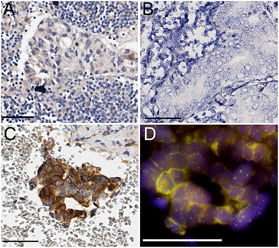 Figure 2: A. MET protein expression. B. Positive RNA in situ signals (arrowheads). C. FISH did not reveal polysomy or MET amplification (MET red, SE7 green). Scale bars represent 50 μm at 40x (A, B) or 63x (C) magnification.