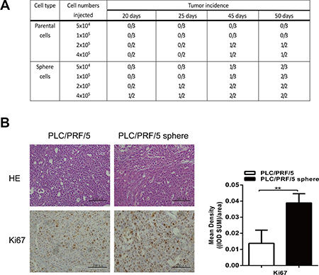 Figure 2: Sphere-forming cells exhibited higher tumorigenicity in vivo. (A) Tumorigenicity experiments of PLC/PRF/5 sphere-forming cells and parental cells in NOD/SCID mice, PLC/PRF/5 sphere cells exhibited significantly stronger tumor-initiating ability. (B) Histologicaland IHC analysis of tumors from PLC/PRF/5 cells and PLC/PRF/5 sphere cells. Hematoxylin and eosin staining of a subcutaneous tumor (upper) and IHC staining of the tumor with anti-Ki-67 (lower). Scale bar = 200 μm. A column drawing represent statistic data for mean density of 5 fields of view. Data was analyzed using IPP 6.0 image analysis software.