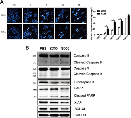 We next determined whether GD55 induces more extensive apoptosis in PLC/PRF/5 sphere cells compared to ZD55. Hoechst 33342 staining assay disclosed that the fractions of nucleic fragmentations were raised more obviously in PLC/PRF/5 sphere cells treated with GD55 compared with ZD55 (Figure 5A). Additionally, expression level of anti-apoptosis protein XIAP and BCL-XL was decreased and the cleavage forms of PARP, caspase 3, caspase 8 and caspase 9 were enhanced in GD55-treated PLC/PRF/5 sphere cells, underlying that GD55 possessed stronger cytotoxic effect than ZD55 (Figure 5B).