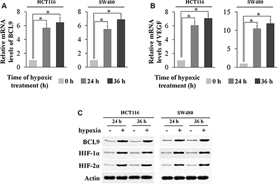 Figure 2: Hypoxia induces BCL-9 expression levels in human colorectal cancer cell lines. Human colorectal cancer cell lines SW480 and HCT116 cells were cultured under the hypoxic condition for the indicated time periods. (A) The mRNA expression levels of BCL-9 in these cells were determined by Taqman real-time PCR and normalized with actin. (B) The mRNA expression levels of VEGF in these cells were determined as a positive control. (C) The BCL-9 protein levels were determined by Western-blot assays. Data are presented as mean ± SD (n = 3). *p < 0.01, Student’s t-test.