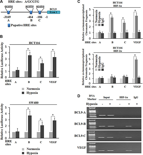 Figure 3: Hypoxia transactivates hypoxia-responsive elements (HREs) in the BCL-9 promoter through HIF-1α. (A) The human BCL-9 gene contains 3 putative HREs in the promoter region. (B) Hypoxia activates the luciferase activity of reporter vectors containing HRE-B or HRE-C sites in the BCL-9 promoter. SW480 and HCT116 cells were transfected with the luciferase reporter vectors, and then subjected to hypoxia treatment for 36 h before measuring luciferase activities. Luciferase reporter vectors containing the HRE site in the VEGF promoter was included as a positive control. (C) and (D) HIF-1α but not HIF-2α binds to HRE-B and HRE-C sites in the BCL-9 promoter under the hypoxic condition in HCT116 cells as determined by ChIP assays. Cells were cultured under the hypoxic or normoxic conditions for 36 h before assays. The HRE site in the VEGF promoter serves as a positive control. The amount of DNA fragments pulled-down was determined by real-time PCR (C) or conventional PCR (D). Data are presented as mean ± SD (n = 3). *p < 0.01 (Student’s t-test).
