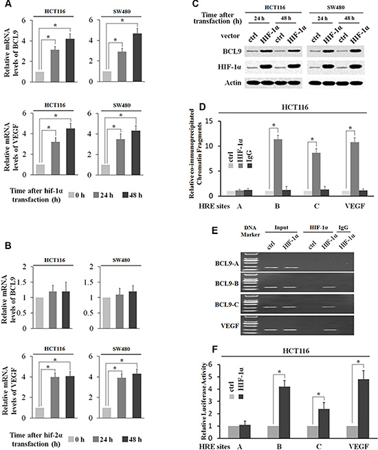 Figure 4: HIF-1α transcriptionally stimulates BCL-9 expression. (A) Ectopic HIF-1α expression increases BCL-9 and VEGF mRNA expression levels in SW480 and HCT116 cells. The mRNA expression levels of BCL-9 and VEGF were determined by Taqman real-time PCR and normalized with actin. (B) Ectopic HIF-2α expression increases VEGF mRNA expression levels but has no effect on mRNA BCL-9 expression levels in SW480 and HCT116 cells. (C) Ectopic HIF-1α expression increases BCL-9 protein levels in SW480 and HCT116 cells as determined by Western-blot assays. (D) and (E) HIF-1α binds to HRE-B and HRE-C sites in the BCL-9 promoter in HCT116 cells transfected with HIF-1α expression plasmids as determined by ChIP assays. The amount of DNA fragments pulled-down was determined by real-time PCR (D) or conventional PCR (E). The HRE site in the VEGF promoter serves as a positive control. (F) HIF-1α activates luciferase activity of reporter vectors containing HRE-B or HRE-C sites in the BCL-9 promoter in HCT116 cells transfected with HIF-1α expression plasmids. Luciferase reporter vectors containing the HRE site in the VEGF promoter was included as a positive control. Data are presented as mean ± SD (n = 3). *p < 0.01 (Student’s t-test).
