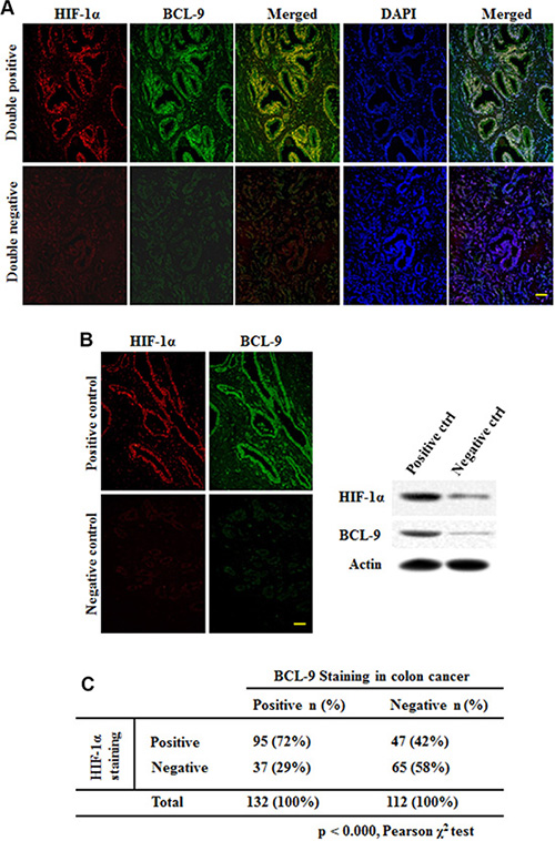 Figure 6: HIF-1α expression is associated with BCL-9 expression in human colorectal cancer specimens. HIF-1α and BCL-9 protein levels were examined on specimens of 244 cases of human colorectal cancer by the double immunofluorescence (IF) co-localization. (A) Representative IF staining results for HIF-1α (upper panels) and BCL-9 (lower panels) are shown. Positive HIF-1α or BCL-9 staining: > 25% cells stained with HIF-1α or BCL-9, respectively. (B) Positive and negative control of BCL-9 expression showed the specificity of staining and were validated by Western-blot assays. Scale bar: bar = 10 μm. (C) HIF-1α expression is associated with BCL-9 expression in human colorectal cancer (p < 0.000, Pearson chi-square test).