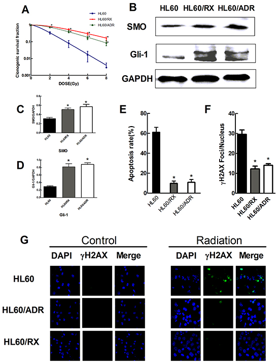 Figure 1: Radiation-resistant HL60/RX cells and adriamycin-resistant HL60/ADR cells show an increased radioresistance and increased activity of the Hedgehog pathway than HL60 cells. A. Survival curves of HL60, HL60/ADR, and HL60/RX cells after radiation. HL60/ADR and HL60/RX cells show great resistance to radiation than the parental cells. B–D. The protein expression of SMO and Gli-1 in HL60, HL60/ADR, and HL60/RX cells. GAPDH was used as loading control. E. The percentage of apoptosis cells in HL60, HL60/ADR, and HL60/RX cells after radiation (4.8Gy). F. Average number of γ-H2AX foci/nucleus after radiation (4.8Gy). G. γ-H2AX formed in the nucleus was more significant in HL60 cells compared with HL60/ADR and HL60/RX cells. *, p<0.001 vs HL60.