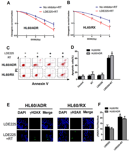 Figure 2: Inhibition of Hedgehog pathway enhances the radiosensitivity both in radio-resistant leukemia and drug-resistant leukemia cells. A, B. Survival curves of HL60/ADR and HL60/RX cells after radiation. C, D. Cell apoptosis distribution showed that the percentage of apoptosis cells significantly increase in cells treated with LDE225 and radiation combined with control, RT alone and LDE225 alone. E, F. The highest increased in γ-H2AX expression was seen in HL60/ADR and HL60/RX cells treated with LDE225 and radiation.*, p<0.001 vs No inhibitor+RT. ×, p<0.001 vs vehicle-treated control group, radiation group, or LDE225 group. #, p<0.01 vs LDE225 group. Abbreviation: RT, radiation.