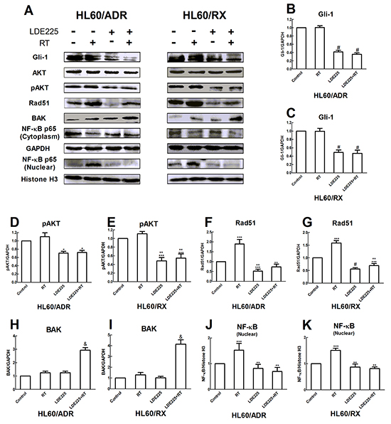 Figure 3: LDE225 enhances the radiosensitivity by downregulating the activation of pAKT and NF-kB in HL60/ADR and HL60/RX cells. A. Cells were treated with vehicle alone, radiation alone, LDE225 alone, and combination therapy (LDE225+radiation) respectively. The protein expression of Gli-1, AKT, pAKT, NF-kB, Rad51, BAK were analyzed by western blot. The quality of separation was monitored using GAPDH as mark B–I. and Histone H3 J, K. Each bar represents the mean ± SD. #, p<0.001 vs vehicle-treated control group or radiation group; *, p<0.01 vs vehicle-treated control group or radiation group **, p<0.001 vs radiation group; ***, p<0.01 vs vehicle-treated control group; &, p<0.001 vs vehicle-treated control group, radiation group, or LDE225 group. Abbreviation: RT, radiation.