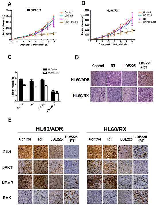 Figure 4: Synergistic effects of LDE225 and radiation on HL60/ADR and HL60/RX cells in vivo. Tumors consisting of HL60/ADR and HL60/RX cells were treated in four ways: vehicle alone, radiation alone, LDE225 alone, and combination therapy (LDE225+radiation). Combination therapy significant delays tumor growth both in HL60/ADR A. and HL60/RX B. C. Nude mice were sacrificed at the 14th day after treatment. The y axis shows the average tumor weight at endpoint. D. Histological change of the tumor tissue by HE staining (×400). E. Expression of Gli-1, p-AKT, NF-kB, and BAK proteins in each group by IHC after treatments for 14 days (400×). **, p<0.001 vs vehicle-treated control group, radiation group, or LDE225 group; *, p<0.01 vs LDE225 group; #, p<0.001 vs vehicle-treated control group, or radiation group. Abbreviation: RT, radiation.