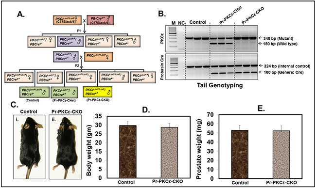 Figure 2: Characterization of floxed PKCε (PKCεLoxP/LoxP) mice using prostate specific Cre (PBCre+). A. Breeding strategy to generate prostate specific conditional PKCε knockout mice. Female founders (F0) PKCεLoxP/LoxP were crossbred with male prostate specific Cre transgenic (PBCre4/+) mice. B. PCR gel picture showing genomic DNA tail genotyping for PKCεLoxP/LoxP, PKCεLoxP/+/PBCre4/+ (Pr-PKCε-CHet), and PKCεLoxP/LoxP/PBCre4/+ (Pr-PKCε-CKO) mice. C. Representative picture of nine week old control floxed PKCε and Pr-PKCε-CKO mice. Bar graph representing the body weight D. and prostate weight E. of control and Pr-PKCε-CKO mice. Value in bar graphs has shown the mean±SE of five mice in each group. No statistical significant difference was observed. Abbreviations: M=molecular weight marker; NC = negative control without DNA.