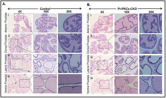 Figure 3: Histopathological analysis of PKCεLoxP/LoxP/PBCre4/- (Control) and PKCεLoxP/LoxP/PBCre4/+ (Pr-PKCε-CKO) mice. A. H&E staining of control mice anterior prostate (i), dorsal prostate (ii), lateral prostate (iii), and ventral prostate (iv). B. H&E staining of Pr-PKCε-CKO mice anterior prostate (i), dorsal prostate (ii), lateral prostate (iii), and ventral prostate (iv). The prostate of Pr-PKCε-CKO mice was indistinguishable from that of the control.