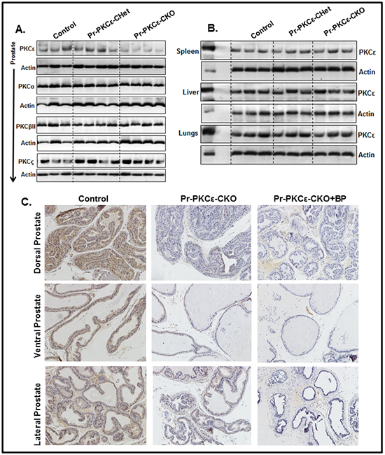 Figure 4: PKCε expression in the prostate of PKCεLoxP/LoxP/PBCre4/- (Control), and PKCεLoxP/LoxP/PBCre4/+ (Pr-PKCε-CKO) mice. A. Protein levels PKCε, PKCα, PKCβII and PKCζ in the prostate lysates of control PKCε-Het (PKCεLoxP/+/PBCre4/+) and PKCε-KO PKCεLoxP/LoxP/PBCre4/+ mice as analyzed by Western blot analysis. B. Protein level of PKCε in the spleen, liver and lungs (PKCεLoxP/LoxP), PKCε-Het (PKCεLoxP/+/PBCre4/+) and Pr-PKCε-CKO PKCεLoxP/LoxP/PBCre4/+ mice as analyzed by Western blot analysis. Fifty µg protein of each sample was loaded on the gel. Each lane of the blots in Figure 4A and Figure 4B represents an individual mouse sample. In Figure 4B, PC denotes the positive control where epidermal lysates (10 µg protein) from PKCε transgenic overexpressing mice (224) was loaded. Equal loading of protein was confirmed by stripping and re-probing the blots with an anti-β-actin antibody. C. Immunohistochemistry analysis of PKCε in the prostate tissues of PKCεLoxP/LoxP (control), and PKCε-CKO PKCεLoxP/LoxP/PBCre4/+ mice, and PKCε blocking peptide. Abbreviations: BP = blocking peptide.