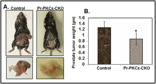 Figure 5: Inhibition of TRAMPC1 cells orthotopic xenograft tumors in prostate specific PKCε knockout (Pr-PKCε-CKO) mice. A. Representative pictures of TRAMPC1 xenograft tumor bearing PKCεLoxP/LoxP and Pr-PKCε-CKO mice. Representative pictures of excised urogenital apparatus of PKCεLoxP/LoxP and Pr-PKCε-CKO mice at 8 weeks. Arrows indicate the development of xenograft tumors in the anterior prostate lobes. B. Bar graph showing prostate tumor weight of PKCεLoxP/LoxP and Pr-PKCε-CKO mice. Values in bar graph represent mean±SE of 4 mice. P<0.05 was considered as significant value.