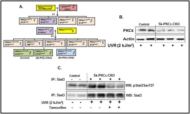 Figure 6: Specific deletion of PKCε in mouse epidermis inhibits phosphorylation of Stat3 in response to UVR irradiation. A. Breeding strategy to generate skin specific conditional PKCε knockout mice. PKCεLoxP/LoxP mice were crossbred with skin specific Cre transgenic (K14Cre+) mice to produce PKCεLoxP/LoxP/K14Cre/+ (Sk-PKCε-CKO) in F2 generation. PKCεLoxP/LoxP (Control), PKCεLoxP/+/K14Cre/+ (Sk-PKCε-CHet), and PKCεLoxP/LoxP/K14Cre/+ (Sk-PKCε-CKO) mice were confirmed by genomic DNA tail genotyping as described in material and methods. Eight week old PKCεLoxP/LoxP (n=4), and Sk-PKCε-CKO (n=4) mice were treated once with tamoxifen (75 mg/kg, i.p.) before UVR exposure (2 kJ/m2). Forty eight hours post-UVR treatment, mice were sacrificed and epidermal lysates prepared. B. PKCε expression in the epidermal lysates of tamoxifen treated, irradiated PKCεLoxP/LoxP and Sk-PKCε-CKO mice as determined by Western blot analysis. Blots were stripped and reprobed for β-actin as a loading control. C. Expression of pStat3Ser727 and total Stat3 in the epidermal protein lysates of tamoxifen treated, irradiated, PKCεLoxP/LoxP and Sk-PKCε-CKO mice as determined by immunoprecipitation (IP)/Western blot (WB) analysis. PC indicates the positive control where 10µg of epidermal protein lysates of PKCε transgenic overexpressing mice (224) was used.