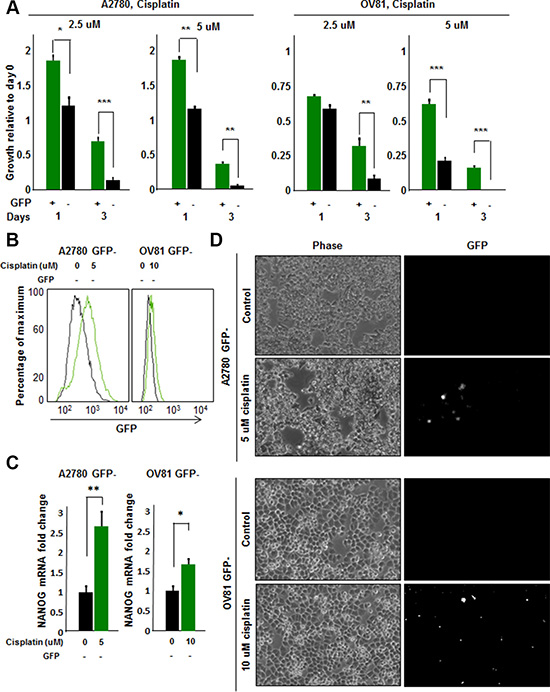 Figure 5: Cisplatin induces stemness in cisplatin-naïve A2780 GFP- cells. (A) Proliferation/survival assay revealed a significant increase in growth and survival of GFP+ A2780 and OV81 cells as compared to GFP–cells at 2.5 and 5 uM concentrations of cisplatin. (B) Histogram of A2780 and OV81 GFP–cells treated with cisplatin. At day 3 of 5 and 10 uM cisplatin treatments, there was an increase in GFP signal as compared to untreated controls in A2780 and OV81 GFP- cells, respectively. (C) Quantitation of NANOG mRNA expression in GFP–A2780 and OV81 cells treated with 5 and 10 uM cisplatin, respectively. After 24 hours of cisplatin treatment, there was a dose-related increase in NANOG mRNA level in treated groups as compared to untreated control. (D) Photomicrographs of control and treated GFP–cells at day 3 of cisplatin treatment. Values represent mean +/− standard deviation, *p < 0.05, **p < 0.01, ***p < 0.001, as assessed by one-way-ANOVA.