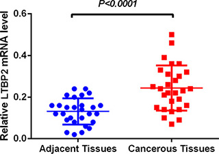 LTBP2 mRNA level was determined in 56 fresh frozen tissue samples, including 28 cancerous tissue samples and 28 matched adjacent normal tissues. Relative LTBP2 mRNA expression level was normalized to the expression of housekeeping gene GAPDH. LTBP2 mRNA expression level was significantly higher in cancerous tissues (0.2430.02049) than in adjacent normal tissues (0.13110.01190) (P < 0.001) (Figure 1).
