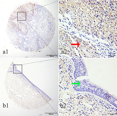 Figure 2: LTBP2 protein was detected in HNSCC tissues but not in adjacent normal tissues. LTBP2 protein was determined by TMA-IHC, a1–a2) HNSCC tissue, positive for LTBP2 protein expression; b1–b2) adjacent normal tissue, negative for LTBP2 protein expression. a1 and b1 are ×40 magnification (bar = 500 μm), a2 and b2 are ×400 magnification (bar = 50 μm). Red arrows indicate positive LTBP2 protein expression on cancerous epithelial cytoplasm, and green arrows indicate negative LTBP2 protein expression on adjacent normal tissue.