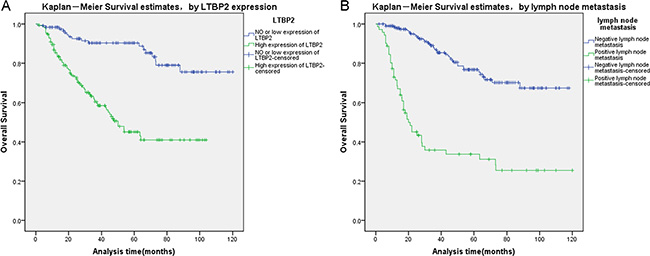 Figure 3: Survival curves of HNSCC patients by the Kaplan–Meier method and the log-rank test. (A) LTBP2+ HNSCC patients (green line, 1) had significantly worse overall survival than LTBP- patients (blue line, 0). (B) HNSCC patients with lymph node metastasis (green line, 1) had significantly worse overall survival than patients without lymph node metastasis (blue line, 0).