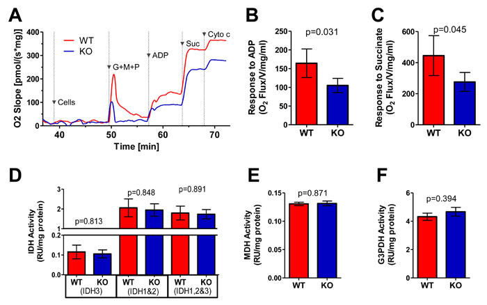 Figure 2: ETC function of WT and KO livers. A. Typical respirometry profiles from WT and KO liver homogenates. Arrowheads indicate the time of addition of glutamate, malate and pyruvate (G,M,P), ADP and succinate (Suc). WT and KO liver preparations were simultaneously assayed in parallel with 10 sets of mice. Cytochrome c was added to test mitochondrial outer membrane integrity. Note that the large, spike in O2 flux seen upon adding G,M,P is an artifact resulting from injecting a large volume of diluted substrates and transiently disturbing the O2 concentration. B. Graphic representation of the ADP responses in mitochondria prepared from 7 sets of WT and KO livers assayed as shown in A. C. Graphic representation of succinate responses. The results in A.-C. were adjusted to account for minor differences in total protein concentrations. D.-F. Assays of selective TCA cycle dehydrogenases [25], including: NAD+- and NADP+-dependent IDHs (IDH3 and IDH1+2) D.; MDH E. and G3PDH F. See Figure S3E for similar assays performed for SDH (Complex II). Assays were performed on 8 sets of WT and KO livers from littermate controls.