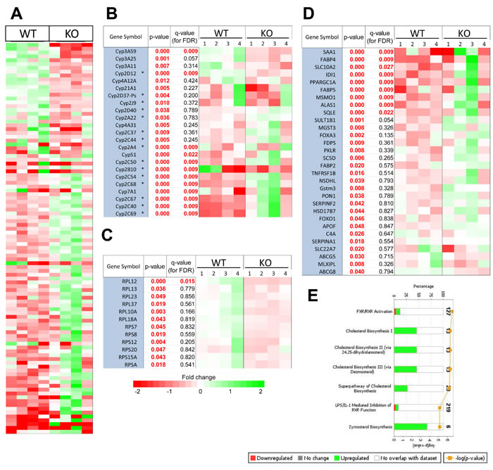 Figure 3: Transcript differences between WT and KO hepatocytes. A. RNAseq results from 4 individual sets each of WT and KO hepatocytes. The 102 differentially expressed transcripts with adjusted FDR q < 0.05 are shown. B. Differences in cyp450 member transcript expression between WT and KO hepatocytes. Those with q < 0.05 were taken from A whereas the others represent significant differences at the level of p < 0.05 among other members of the cyp450 family. Those encoding members of the CLAN 2 family [26] are indicated by asterisks. C. Differentially expressed transcripts encoding ribosomal proteins (p < 0.05) are listed. RPL12 is from A. D. Differential gene expression profiling of genes involved in the top 7 deregulated pathways identified by Ingenuity Pathway Analysis. Note that the cyp450 members shown in B are not repeated here but were included and found to be significant in the pathway analysis of cholesterol metabolism. E. The top 7 classifications of all significantly deregulated (p < 0.05) transcripts according to their involvement in specific pathways based on Ingenuity profiling. The top axis represents the percentage of genes comprising that pathway whose transcripts were differentially expressed between WT and KO hepatocytes. Green bars indicate transcripts that were up-regulated in KO hepatocytes and red bars indicate down-regulated transcripts. Some transcripts are included in more than one pathway. Orange circles indicate the log10 p value indicating the probability that the differentially expressed transcripts within a specific pathway would have been selected randomly. Numbers on the right indicate the number of transcripts assigned to the indicated pathway.
