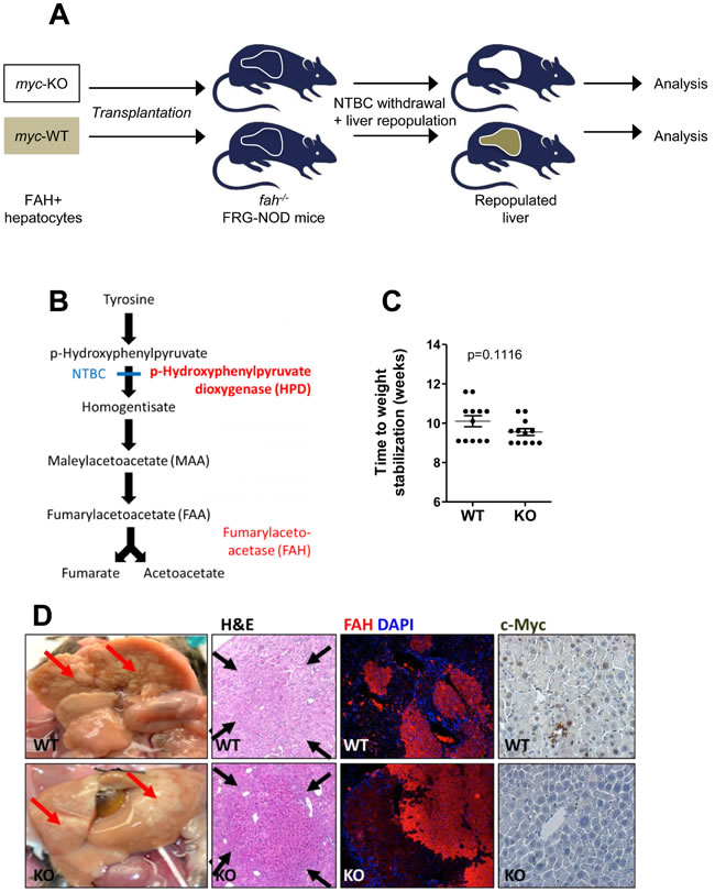 Figure 4: Rescue of FGR-NOD mice with fah+/+ WT and KO hepatocytes occurs at equivalent rates. A. Schematic for repopulating fah-/- NOD-SCID mice with WT or KO donor fah+/+ hepatocytes B. Pathway of hepatic tyrosine catabolism. FAH’s absence causes accumulation of the toxic upstream intermediates maleyl- and fumarylacetoacetate. Animals can be rescued by blocking the more proximal enzyme hydroxyphenylpyruvate dioxygenase with NTBC or by transplanting fah+/+ hepatocytes. C. 3x105 hepatocytes from WT or KO mice (both fah+/+) were inoculated intrasplenically into recipient fah-/- FRG-NOD mice. 4 days later, NTBC cycling began until body weight stabilized at > 100% of the pre-transplant weight. No differences were seen in the times needed to achieve NTBC independence and body weight stabilization according to a Students’ t-test. D. Gross appearance of recipient FRG-NOD livers 12-14 weeks after transplantation of WT or KO hepatocytes. Livers have been flushed with PBS to facilitate visualization of regenerating nodules (arrows). H&E staining of post-transplant livers showing regenerating nodules of donor cells (arrows). FAH immuno-staining of donor-derived fah+/+ nodules (red) in recipient fah-/- FRG-NOD mice. Note the lack of staining of adjacent, fah-/- recipient hepatocytes. Tissues were counterstained with DAPI (blue). Myc immuno-staining of regenerating hepatic nodules. Numerous representative Myc-positive nuclei in a regenerating nodule following transplantation with WT hepatocytes are shown in the top panel. Note the absence of Myc in a similar nodule repopulated with KO hepatocytes (lower panel). At least 10 sets of repopulated livers were examined for these studies.