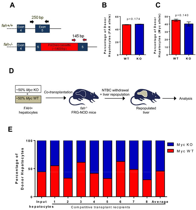 Figure 5: WT and KO hepatocytes are equally proficient at re-populating the hepatic parenchyma. A. PCR-based strategy to distinguish fah+/+ donor and fah-/- recipient alleles. B. Hepatocytes were isolated from 11 recipient animals 17-18 weeks after transplanting with WT or KO hepatocytes and ~6 weeks after NTBC discontinuation. PCR of fah alleles showed no difference by Students’ t-test in the contribution of WT and KO myc alleles to the repopulated liver. C. The strategy depicted in Figure S1B and C (black and blue arrows) was used to amplify the myc alleles from the same hepatocyte samples used in B. D. Schematic for competitive transplants of Myc WT and KO hepatocytes. E. 8 FRG-NOD mice were transplanted with a ~1:1 mixture of 1.5x105 hepatocytes each from WT and KO donors (input) and allowed to achieve NTBC independence. Following repopulation, PCR quantification of fah alleles again showed that the donor populations comprised ~40% of the total hepatocyte mass (not shown). This was confirmed by amplification of the three myc alleles. Shown here is the proportion of the donor population in each animal that was comprised of Myc WT and KO donor hepatocytes. Note that the average allelic composition of this group was identical to that of the input population. Each set of PCR reactions was performed in triplicate for each population of hepatocytes.