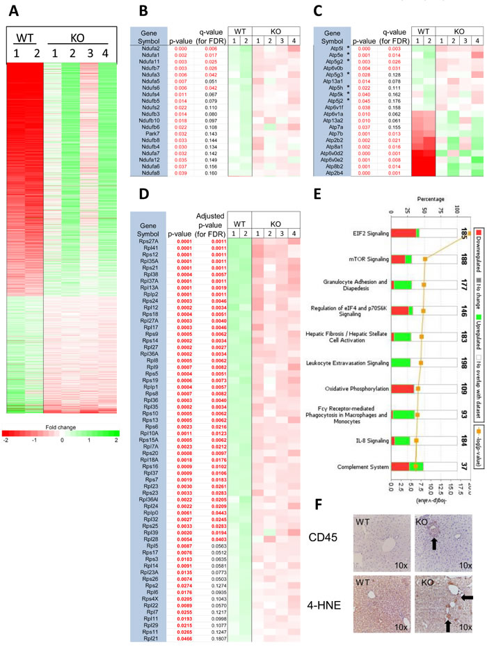 Figure 7: Transcriptional profiling of post-transplant hepatocytes. A. RNAseq results for all 1784 differentially expressed transcripts with q values < 0.05 from isolated hepatocytes from 2 WT and 4 KO mice. B.-D. Gene ontology profiling for transcripts involved in common functions identified 20 encoding components of Complex I, 20 encoding various ATPases and 61 encoding ribosomal components. E. Ingenuity Pathway Analysis depicting the most de-regulated functionally related groups of transcripts shown in A. Green bars and red bars indicate transcripts that are up-regulated and down-regulated, respectively in cells isolated from animals transplanted with KO hepatocytes. Transcripts levels from these top 10 pathways are represented in Table S3.