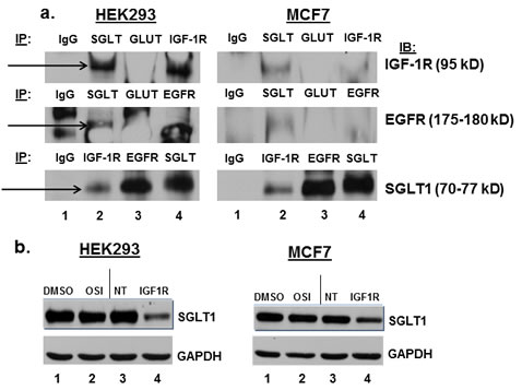 Figure 3: IGF-1R and SGLT1 interact in HEK293 and MCF7 cells, and IGF-1R siRNA transfection results in down-regulation of SGLT1. (a) HEK293 and MCF7 cells were lysed with RIPA buffer, and 500-1000 ug of protein was immuno-precipitated with IgG isotypic control, anti-SGLT1, anti-GLUT, or anti-IGF-1R plus protein A/G beads. Immuno-precipitated extracts were run on an 8% SDS-PAGE gel, immuno-blotted, and probed with anti-IGF-1R, anti-EGFR, or anti-SGLT1. Experiment shown is representative of at least three experiments. Arrows indicate the interaction. (b) HEK293 and MCF7 cells were treated with vehicle (DMSO), 1 uM OSI-906, or transfected with non-targeted siRNA or IGF-1R siRNA for 48 hours. Inhibition of IGF-1R with siRNA also decreases protein expression of SGLT1 (lane 4), whereas OSI-906 has no effect on the expression of SGLT1. GAPDH served as a loading control.