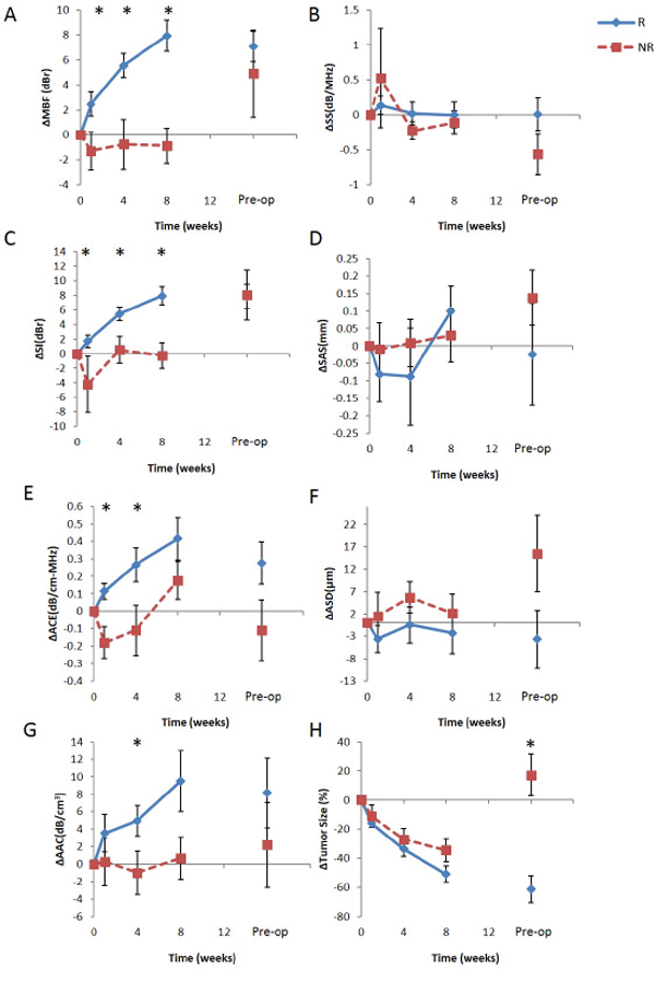 Currently the standard of care for patients receiving NAC only includes pre-treatment and post-treatment imaging, using typically DCE-MRI, but does not routinely include intra-treatment imaging for tumor size assessment. Furthermore, ultrasound imaging is not reliable for tumor size measurement due to attenuation artefacts which cast shadows on the distal end of deep-set tumors. However, this had minimal effect on QUS assessment in this study, since the ROIs were selected in the center of the tumor (~ 90% coverage), avoiding regions of artefacts. Although intra-treatment tumor size was recorded in this study as measured by the physician during follow-up physical examinations, this method has limited reproducibility since measurements were made by different physicians. Thus, measurements reported here should be assumed approximate.