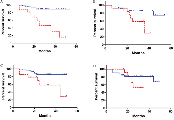 Figure 4: Kaplan-Meier survival curves for responding (solid line) and non-responding (dashed line) patients. Patients were classified based on clinical/histopathological information. A. Patients were classified based on the QUS biomarkers (including week 0 data) obtained at weeks 1, 4, and 8, respectively B, C, D.