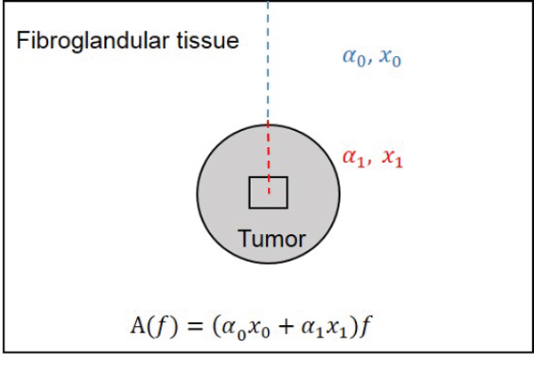 Breast ultrasound data were collected by an experienced sonographer using a clinical scanner (Sonix RP, Ultrasonix, Vancouver, Canada) employing a 6 MHz center frequency linear array transducer (L14-5-60), sampling at a rate of 40 MHz, with the focus set at the midline of the tumor and maximum imaging depth set to 4-6 cm, depending on tumor size and location. Standard B-mode imaging was used for anatomical navigation, and acquisition volume was determined based on the tumor location reported in biopsy findings. Approximately 3-5 image planes were acquired from the tumor, depending on the tumor size. Regions of interest (ROI) were contoured around the tumor within each image plane and segmented into smaller blocks, called RF blocks. The ROI was then divided into 2 by 2 mm blocks, with adjacent overlap of 80% in both axial and lateral directions. A 2 by 2 mm RF block corresponds to 10 spatial pulse lengths axially and 5.5 beamwidths laterally, which meets the minimum ROI size requirements for obtaining reliable scatterer property estimates [30, 31]. A normalized power spectrum was then computed for each RF block using a phantom reference, and was corrected for the total attenuation, A(f), from the top of the image down to the center of the RF block, as illustrated in Figure 5. The total attenuation consisted of two components: attenuation of the intervening tissue, α0, assumed to be 1 dB/cm-MHz based on reported ultrasound tomography measurements of the breast [32], and the local attenuation estimate of the ROI, α1, which is also referred to here as ACE and is estimated using the spectral difference method [33]. After obtaining attenuation corrected normalized power spectra from all RF blocks within the ROI, a parametric image was computed for each QUS parameter. The QUS parameters investigated were MBF, SS, SI, SAS, ACE, ASD, and AAC. More details about QUS analysis are provided in the appendix. Since spectral normalization was performed using a homogeneous tissue-mimicking phantom prior to parameter estimation, effects of tumor depth and size were minimized. In addition to acquiring ultrasound data, tumor sizes reported by oncologists by physical examination in the follow-up visits were also examined. Size reports were corroborated by ultrasound imaging results but clinical physical examination documentation was used for tumor size measures.