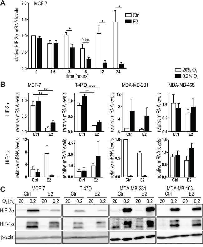 Figure 1: HIF-2α regulation by estrogen in breast cancer cell lines. A. MCF-7 cells were treated with 10 nM E2 for the indicated time periods. HIF-2α mRNA levels were quantified by RT-qPCR, corrected for the endogenous L28 mRNA levels and normalized to the starting time point. B. ERα positive (MCF-7 and T-47D) and ERα negative (MDA-MB-231 and MDA-MB-468) breast cancer cell lines were treated with 10 nM E2 for 24 hours under normoxic or hypoxic conditions. HIF-2α mRNA levels were quantified as above. Shown are mean values ± standard errors of the mean (SEM) of three to four independent experiments. For statistical evaluation, the effects of E2 treatment were compared with the ethanol solvent control (Ctrl) treatment. *P<0.05; **P<0.01; ***P<0.001. C. HIF-2α protein was detected by immunoblotting and constitutively expressed β-actin was used as loading and blotting control.