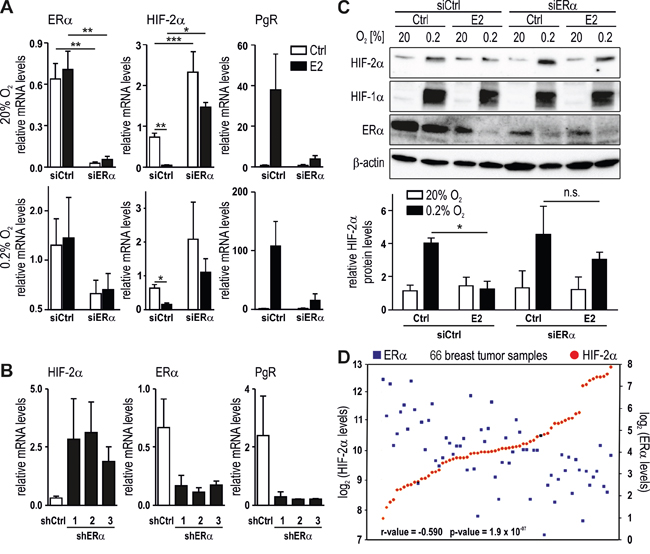 Figure 3: Reciprocal regulation of HIF-2α and ERα. ERα was knocked down in MCF-7 cells using siERα (A and C) or shERα (B) and then treated with 10 nM E2 under normoxic or hypoxic conditions. mRNA and protein levels were subsequently determined by RT-qPCR (A and B) and immunoblotting (C, upper panel), respectively. Shown are mean mRNA (A and B) and protein (C, lower panel) values ± SEM of three independent experiments. For statistical evaluation, the effects of ERα silencing were compared with siCtrl cells; the effects of E2 treatment were compared with ethanol solvent control (Ctrl) treatment. n.s., not significant; *P<0.05; **P<0.01. D. Microarray data from public databases were compiled using the R2 genomic analysis tool. Significance of the negative correlation between HIF-2α (red dots) and ERα (blue squares) mRNA levels was assessed by one-way ANOVA.