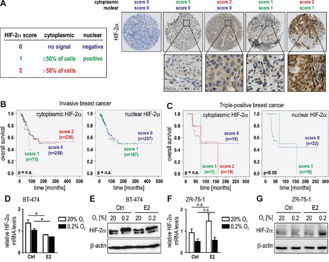 Figure 4: HIF-2α as a prognostic factor in HER2 positive breast cancer. A. Scoring system and representative images for cytoplasmic and nuclear HIF-2α staining of invasive breast cancer tissues. B. HIF-2α was scored in tissue microarrays of 608 invasive breast cancer cases (excluding triple-negative cases) and displayed in Kaplan-Meier survival curves. C. Survival curves of hormone receptor positive and HER2 overexpressing breast cancer patients according to HIF-2α scores. D to G. Triple-positive BT-474 and ZR-75-1 breast cancer cells were treated with 10 nM E2 for 24 hours under normoxic or hypoxic conditions, and mRNA (D, F) and protein (E, G) levels of HIF-2α were determined. Shown are mean mRNA values ± SEM of three independent experiments. For statistical evaluation, the effects of E2 treatment were compared with ethanol solvent control (Ctrl) treatment. *P<0.05; n.s., not significant.