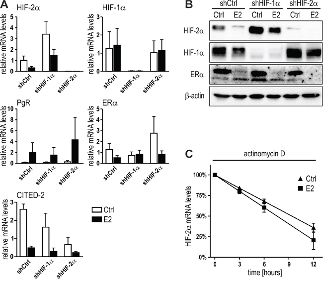 To address the functional mechanism underlying HIF-2α inhibition by E2/ERα, we investigated known candidate HIF-2α inhibitors. We and others previously reported the mutual inhibition of HIF-1α and HIF-2α [40, 7]. Because E2 has been shown to induce HIF-1α expression [33], we hypothesized that increased HIF-1α might subsequently decrease HIF-2α. This hypothesis was tested by adding E2 to stably HIF-1α or HIF-2α depleted MCF-7 cells. As expected, shHIF-1α MCF-7 cells express higher levels of HIF-2α mRNA, whereas shHIF-2α had no effect on HIF-1α mRNA levels in this cell line (Figure 5A). Both, PgR and ERα remained largely unaffected by either HIF-1α or HIF-2α knockdown, and E2 downregulated HIF-2α in shHIF-1α to the same extent as in shCtrl cells. Also CITED-2, a preferential HIF-2 target gene [41, 10], was still downregulated by E2 in shHIF-1α MCF-7 cells (Figure 5A). Similar results were obtained on the protein level (Figure 5B), suggesting that mutual HIFα inhibition does not play any role in E2/ERα-dependent HIF-2α downregulation.