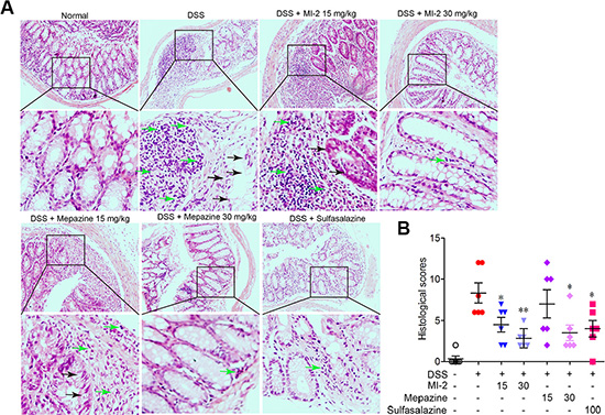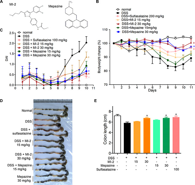 Colitis was induced in C57BL/6 mice with 2.5% DSS (molecular weight 36–50 kDa) dissolved in drinking water (days 1–7). Normal mice were given water. Vehicle control (PBS), MI-2 (15, 30 mg/kg) and mepazine (15, 30 mg/kg) were given i.p from day 1 to day 10, respectively.
