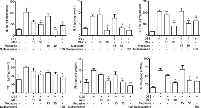 To examine the effects of MALT1 inhibitors on the cytokine expression in acute DSS colitis model, we measured the levels of IL-1β, IL-6, TNF, IFN-γ, IL-17A and IL-18 in colons of mice following induction of colitis and treatments with MALT1 inhibitors. As shown in Figure 3, ELISA analysis for the cytokine levels in colonic homogenated protein from each group showed that IL-1β, IL-6, TNF, IFN-γ, IL-17A and IL-18 were remarkably increased after DSS challenge. MI-2 and mapzine at 30 mg/kg can significantly inhibit the elevation of all cytokines in colon after DSS challenge.