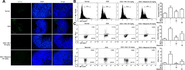 Figure 5: MALT1 inhibitors inhibited NLRP3 inflammasome activation in mice with DSS-induced colitis. (A) Sections of colonic tissue were immunostained with DAPI (blue) and anti-CD11b-FITC (green) and observed by confocal laser-scanning microscope, 100×. (B) Spleen cells were extracted from colitis mice in each group at day 7 and CASP1 activation in CD11b+cells was analyzed by FACS staining. (C) Th1/Th17 differentiation in mice with DSS-induced colitis. Splenocytes was isolated from each group of mice and restimulated with PMA/ionomycin/monensin for 4 h. Th1 and Th17 cells were analyzed by intracellular staining of IFN-γ and IL-17A in the CD4 gate. Numbers in quadrants indicate percent cells in each throughout. Data are presented as means ± SEM. *P < 0.05 vs. DSS-treated group.