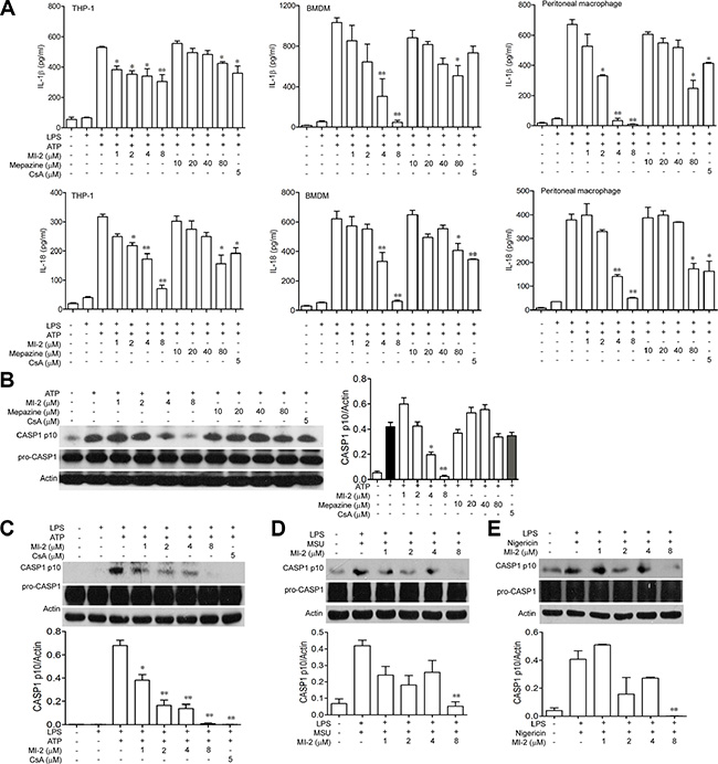 Figure 7: MI-2 inhibited IL-1β/IL-18 processing in THP-1 cells. (A) LPS-primed THP-1/BMDM/peritoneal macrophage cells were treated with MI-2 or Mepazine (1, 2, 4, 8 μM) or CsA (5 μM) for 1 h, following by 1 h incubation of 5 mM ATP. Released IL-1β/IL-18 in the supernatant were analyzed by ELISA. Data are presented as means ± SEM of three different experiments. (B) LPS-primed THP-1 cells were treated with MI-2 or Mepazine (1, 2, 4, 8 μM) or CsA (5 μM) for 1 h, following by 1 h incubation of 5 mM ATP. Protein levels of pro-CASP1, cleaved CASP1, ASC and NRLP3 were determined by western blot. (C) LPS-primed THP-1 cells were treated with MI-2 or CsA (5 μM) for 1 h, following by 1 h incubation of 5 mM ATP. Protein levels of pro-CASP1, CASP1 p10, ASC and NRLP3 were determined by Western blot. (D, E) LPS-primed THP-1 cells were treated with MI-2 (1, 2, 4, 8 μM) or CsA (5 μM) for 1 h, following by 1 h incubation of 500 μg/ml MSU or 2 h incubation of 10 μM Nigericin. Protein levels of pro-CASP1, CASP1 p10, were determined by western blot. *P < 0.05, **P < 0.01 vs. LPS+ATP/MSU/Nigericin group.